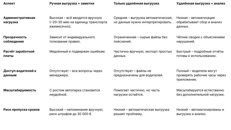 Все три модели позволяют выполнить требования по выгрузке данных. Но различия становятся заметны, когда речь идёт о повседневной работе. Только один подход действительно снижает нагрузку на администраторов, масштабируется вместе с автопарком и даёт прозрачную картину по рабочему времени и отдыху.